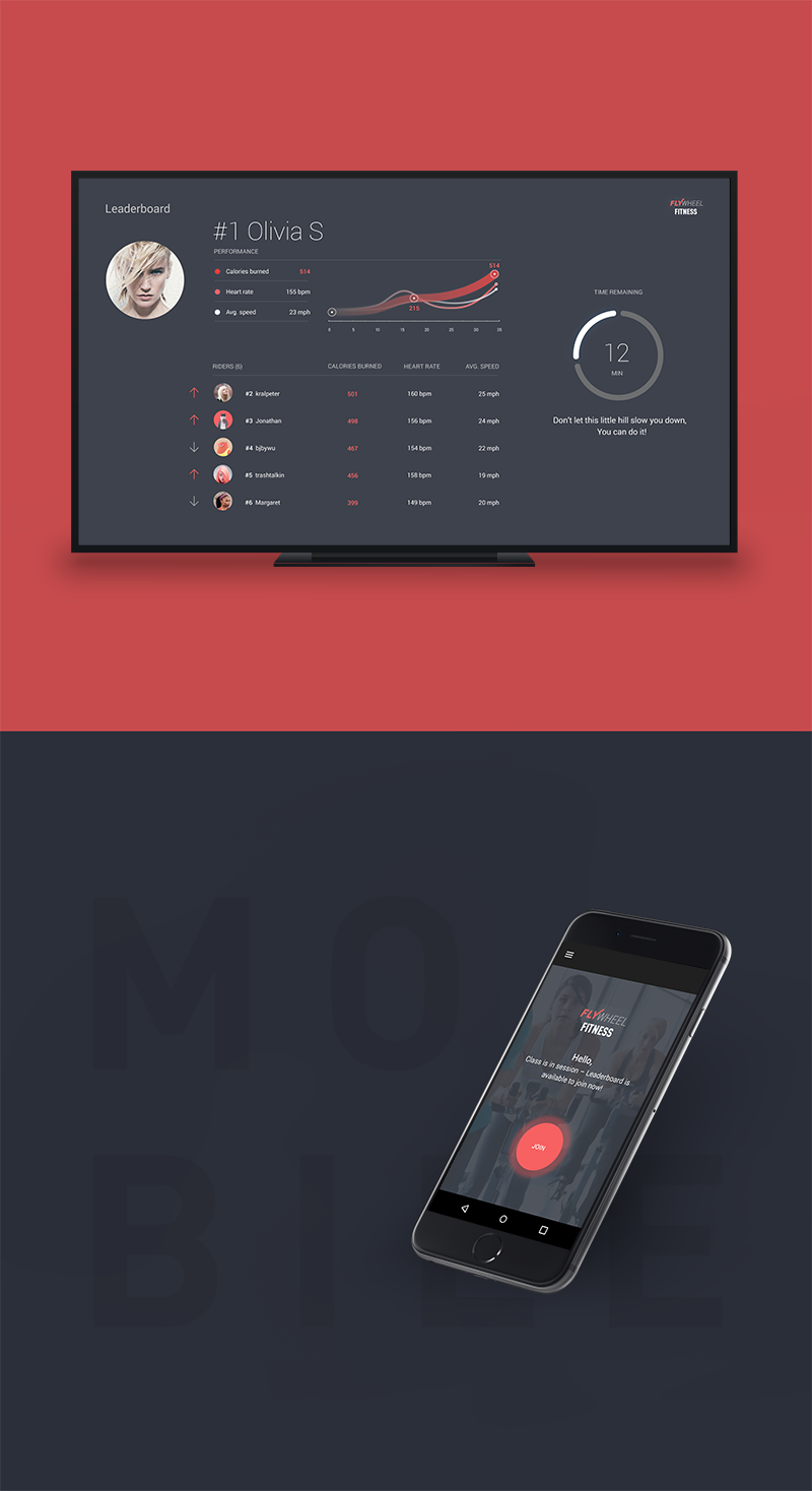 For exercises that generate real-time performance data (e.g. distance, calories burned, repetitions), many fitness classes encourage friendly competition through a digital leaderboard visible to their students for the duration of a session. Design a two-screen experience including a large television display for the leaderboard and a simple smartphone app for agreeing to participate and choosing a public identity. Provide high-fidelity mocks for each of these screens.