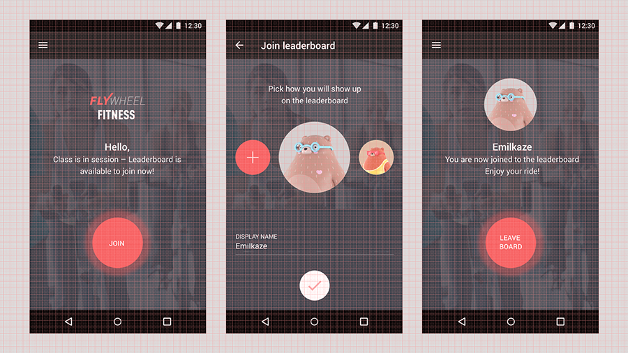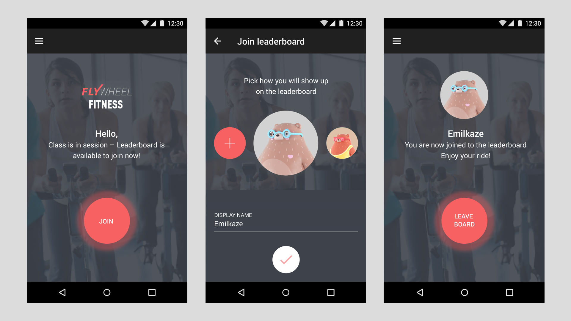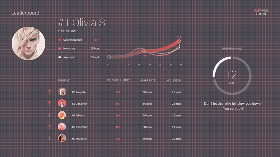 Emily is a 25 years old young professional who wants to exercise more. She just joined a spin class at FlyWheel Fitness with her boyfriend. In the session, she saw that there is a big TV leaderboard that shows people’s real-time performance. She found that she can join the leaderboard via the FlyWheel phone app she already downloaded.