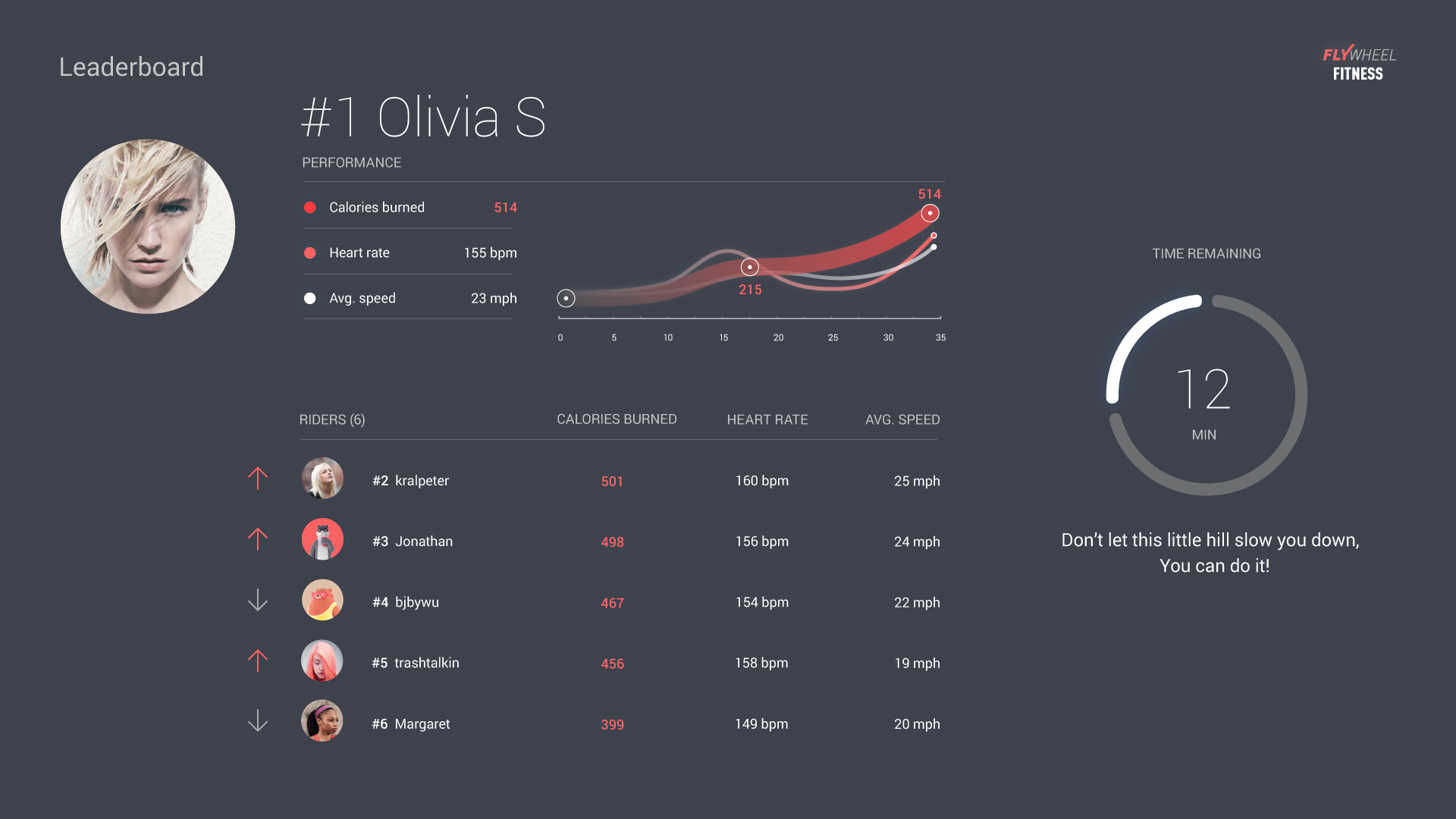 Top performer gets a highlighted section with more detailed infographic about user’s real-time performance over time, such as calories burned, heart rate, distance, etc. This acts as a reward to motivate other users so they too can be shown up here. - Position arrow